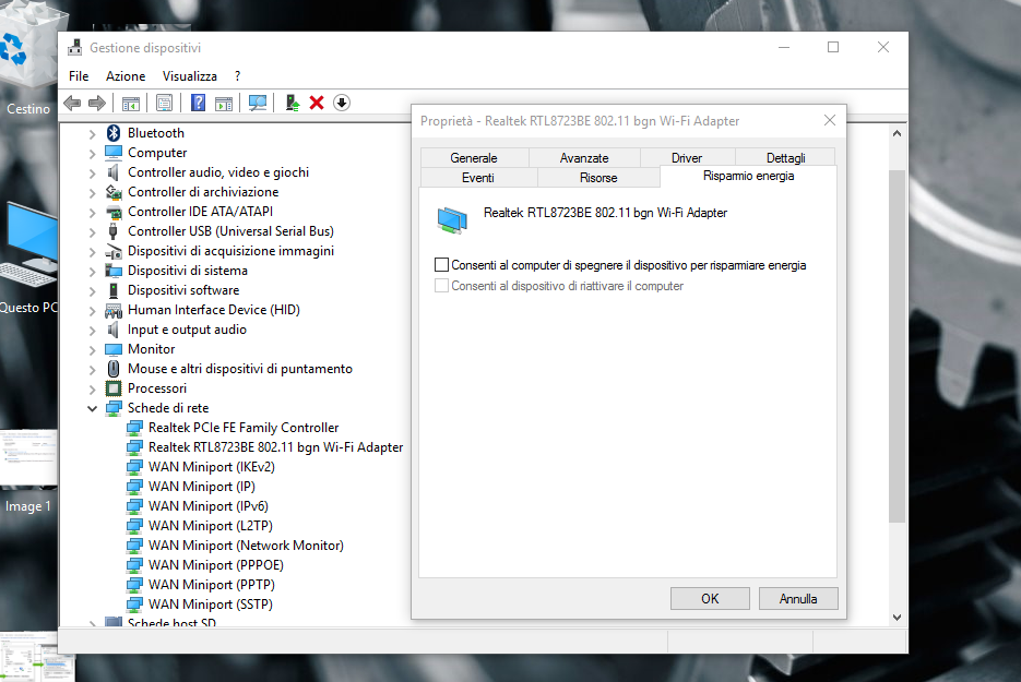 Nella finestrella che si รจ appena aperta pigia in alto su risparmio energia e deseleziona la casella con la scritta consenti al computer di spegnere il dispositivo per risparmiare energia