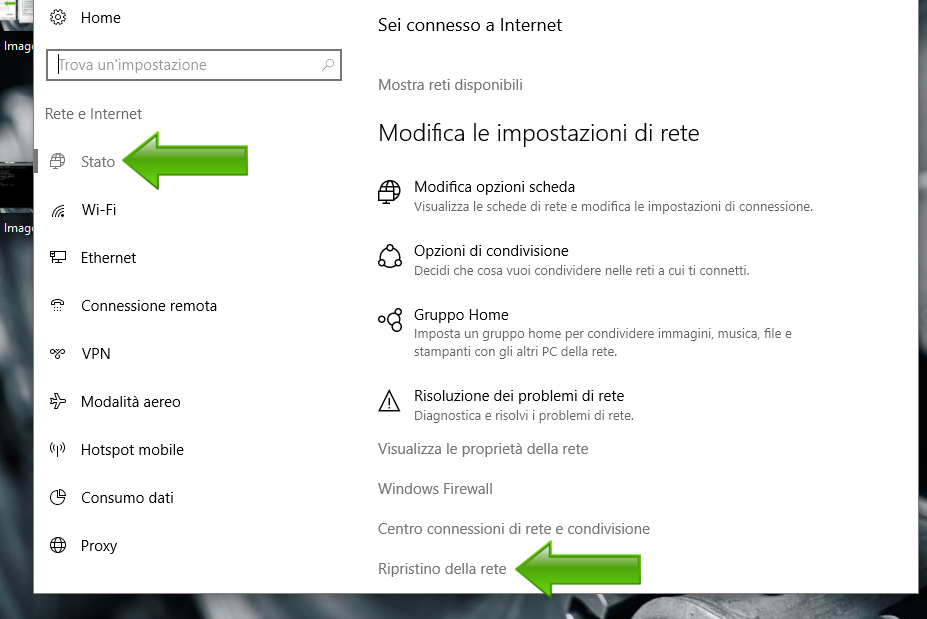 Adesso, in Stato, clicca sull' ultima voce in basso - Ripristino della rete