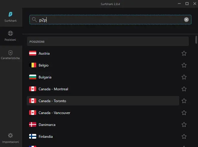 Poi ho avuto l'idea di scrivere direttamente sul campo di ricerca (sopra a Locations "Posizioni") il termine "p2p", trovando cosรฌ tutti i server ottimizzati per i miei test.